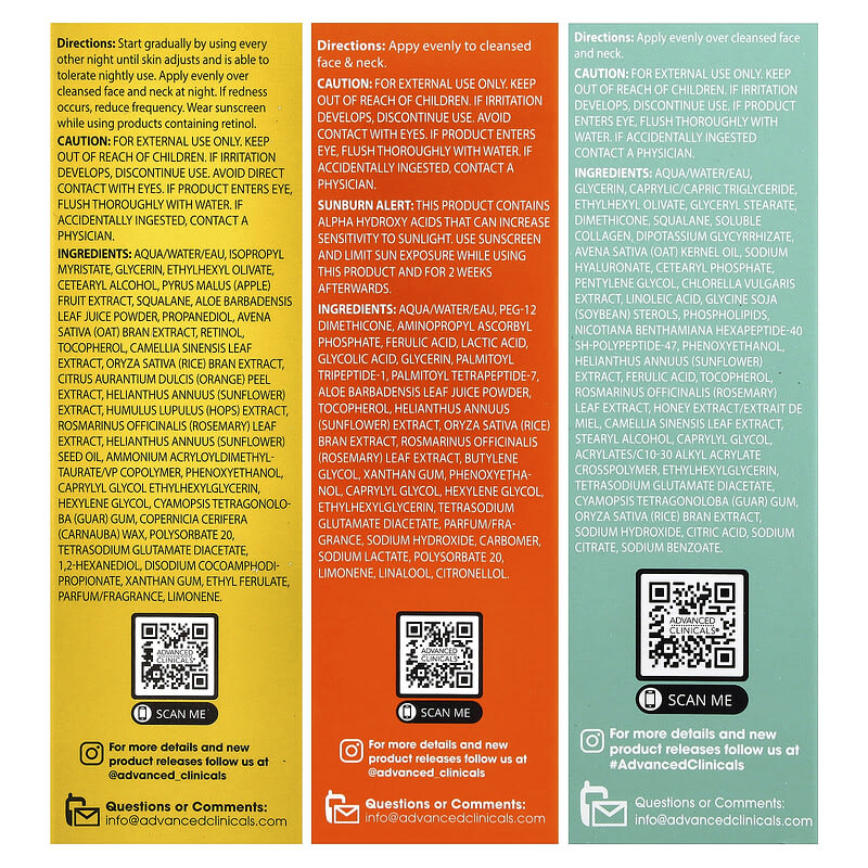 Bộ ba huyết thanh hoạt động Advanced Clinicals Active Serum Trio Set cung cấp cho bạn ba sản phẩm chăm sóc da thiết yếu để giúp bạn có được làn da khỏe mạnh và rạng rỡ. Bộ sản phẩm này bao gồm huyết thanh retinol, huyết thanh vitamin C và huyết thanh axit hyaluronic, mỗi loại đều được thiết kế để giải quyết các mối quan tâm cụ thể về da.