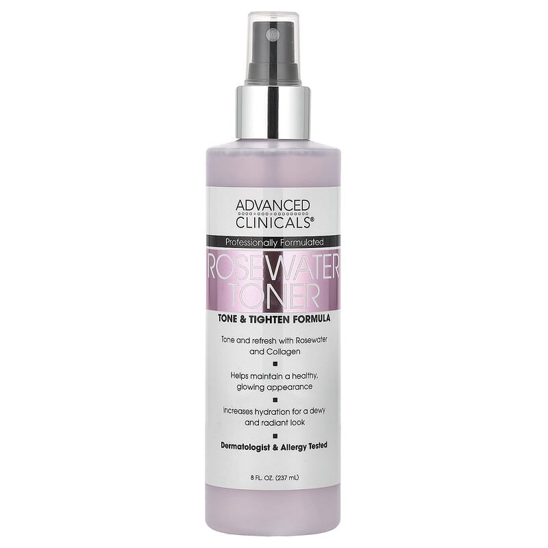 Advanced Clinicals Rosewater Toner, Tone & Tighten Formula là một loại toner làm sạch sâu và làm săn chắc da, được làm từ nước hoa hồng hữu cơ và các thành phần tự nhiên khác. Sản phẩm giúp làm sạch bụi bẩn và dầu thừa, thu nhỏ lỗ chân lông, cân bằng độ pH cho da, và cung cấp độ ẩm cần thiết. Nước hoa hồng có đặc tính làm dịu và chống viêm, giúp giảm mẩn đỏ và kích ứng da. Công thức này phù hợp cho mọi loại da, kể cả da nhạy cảm, và có thể sử dụng hàng ngày như một phần của quy trình chăm sóc da.