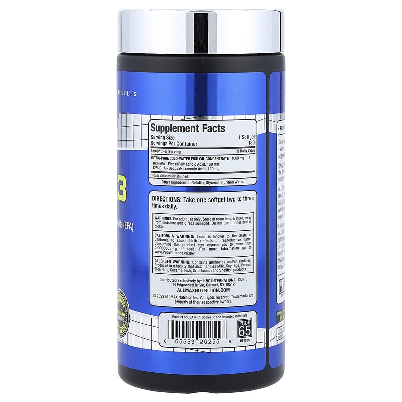 Allmax Essentials Omega-3 180 Softgels cung cấp một nguồn axit béo thiết yếu từ dầu cá tự nhiên, với 180 mg EPA và 120 mg DHA mỗi viên, được thiết kế để hỗ trợ sức khỏe tim mạch và chức năng não bộ tối ưu.