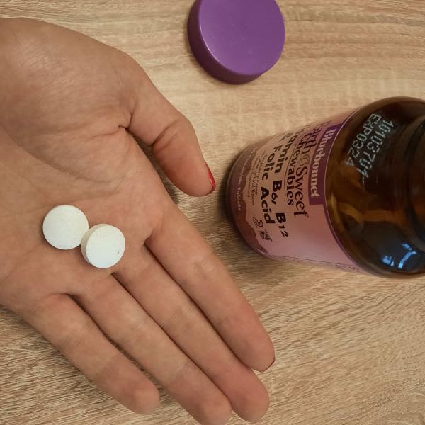 Bluebonnet Nutrition Earth Sweet Chewables Vitamin B6, B12, Folic Acid là thực phẩm bổ sung dạng viên nhai hương quả mâm xôi, cung cấp sự kết hợp của vitamin B6 (dưới dạng pyridoxine HCl), vitamin B12 (dưới dạng cyanocobalamin) và axit folic. Mỗi viên chứa 25 mg vitamin B6, 500 mcg vitamin B12 và 400 mcg axit folic. Sản phẩm được làm ngọt bằng chiết xuất trái cây (FruitSource®) và không chứa đường, gluten, sữa, đậu nành hay các chất gây dị ứng chính. Thích hợp cho người ăn chay.