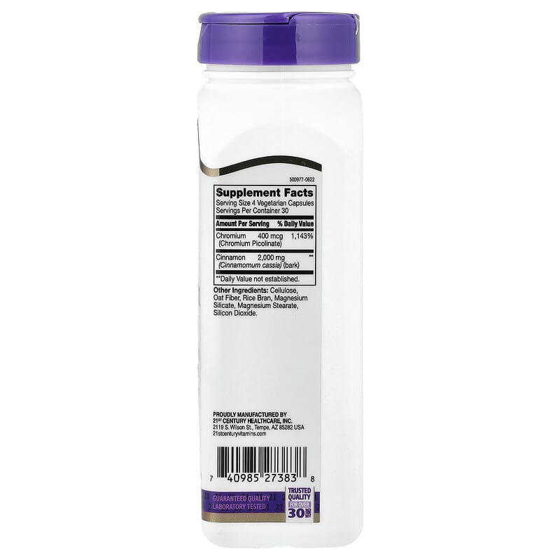21st Century Cinnamon Plus Chromium là một chất bổ sung chế độ ăn uống được thiết kế để hỗ trợ sức khỏe trao đổi chất và duy trì mức đường huyết bình thường. Sản phẩm này kết hợp quế, một loại gia vị được biết đến với đặc tính hỗ trợ sức khỏe, với crom, một khoáng chất thiết yếu đóng vai trò trong quá trình chuyển hóa carbohydrate và chất béo. Các viên nang thuần chay này phù hợp với nhiều chế độ ăn kiêng và cung cấp một cách tiện lợi để kết hợp những thành phần có lợi này vào thói quen hàng ngày của bạn.