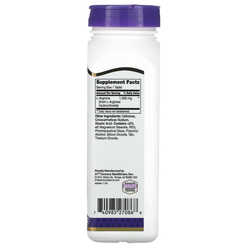 21st Century L-Arginine 1,000 mg 100 Tablets là một chất bổ sung axit amin hỗ trợ sức khỏe tim mạch và tuần hoàn. Mỗi viên cung cấp 1000 mg L-Arginine, một axit amin thiết yếu mà cơ thể sử dụng để sản xuất oxit nitric, giúp thư giãn mạch máu và cải thiện lưu lượng máu. Sản phẩm này không chứa đường, muối, men, lúa mì, gluten, đậu nành, sữa, hương vị nhân tạo, chất tạo ngọt nhân tạo, chất bảo quản hoặc màu nhân tạo, phù hợp cho người ăn chay.