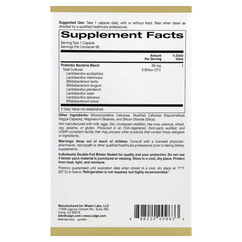 Thành phần: Mỗi viên nang chứa: Lactobacillus acidophilus (CUL-60 và CUL-21), Bifidobacterium lactis (CUL-34), Lactobacillus plantarum (CUL-66), Lactobacillus paracasei (CUL-08), Bifidobacterium longum (CUL-62). Tổng số lợi khuẩn: 5 tỷ CFU.