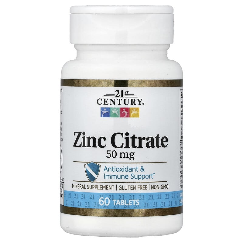 21st Century Zinc Citrate cung cấp 50 mg kẽm citrate trong mỗi viên nén, một khoáng chất thiết yếu hỗ trợ chức năng miễn dịch, sức khỏe làn da và sự phát triển tế bào. Sản phẩm này là một lựa chọn thuần chay, không chứa gluten, phù hợp với nhiều chế độ ăn uống.